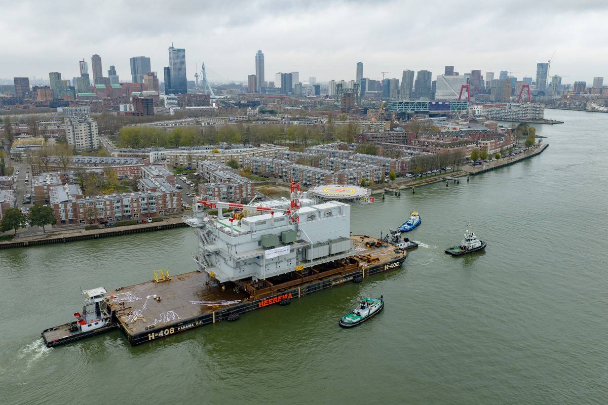 The topside, measuring 48 metres by 33 metres and weighing about 4,500 tonnes, departed HSM Offshore Energy’s Stormpolder yard and travelled through central Rotterdam in a high-profile transit. The 72-metre-high jacket sailed from Smulders’ Vlissingen yard.